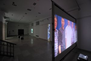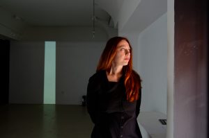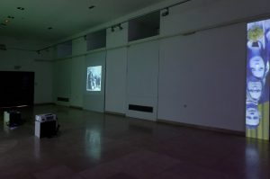 Video installation consists of a darkened, empty room (or space) and one audio-visual piece that is projected onto the wall. The video is projected from the ceiling onto the front wall.