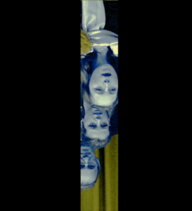 While the space is dominated by sound, and the image is compressed into a narrow longitudinal light gap, the blue and semi-alive faces of the choristers (those “from the far side”) are crawling and breaking through from both the left and right, thus becoming pendulous moving targets in the sight of the spectator-voyeur.