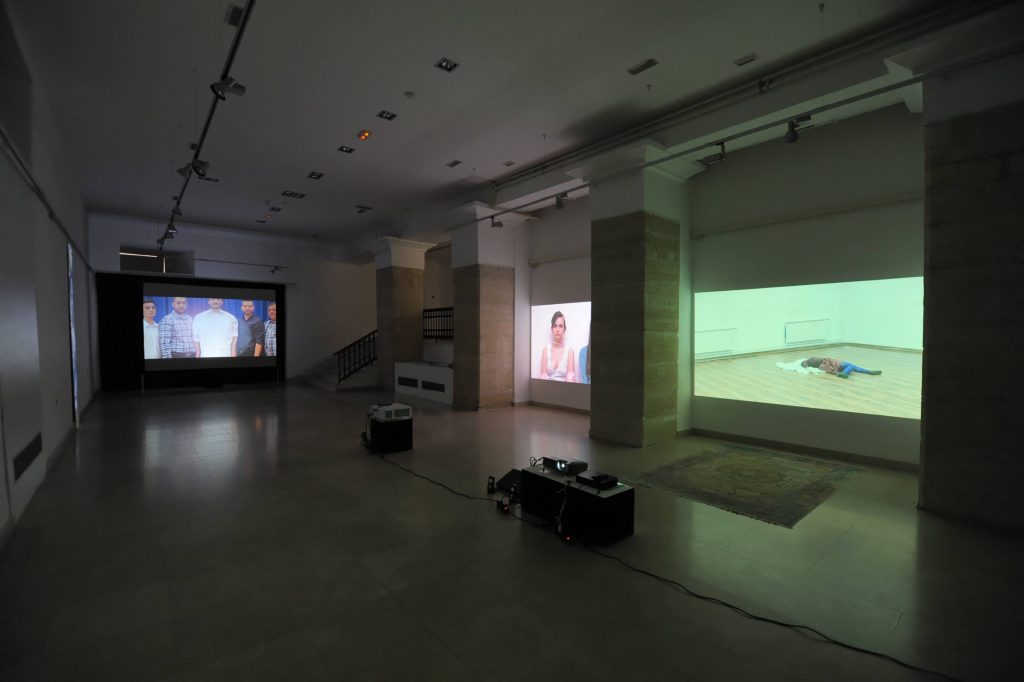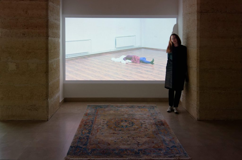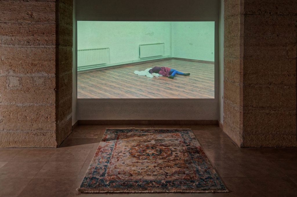 The video installation includes a video projection on the wall and a rug placed on the ground in front of the projected image. The rug should be centred beneath the image, approximately 20 cm from the wall. The video plays on a continuous loop.