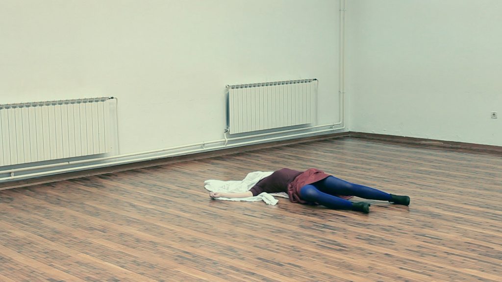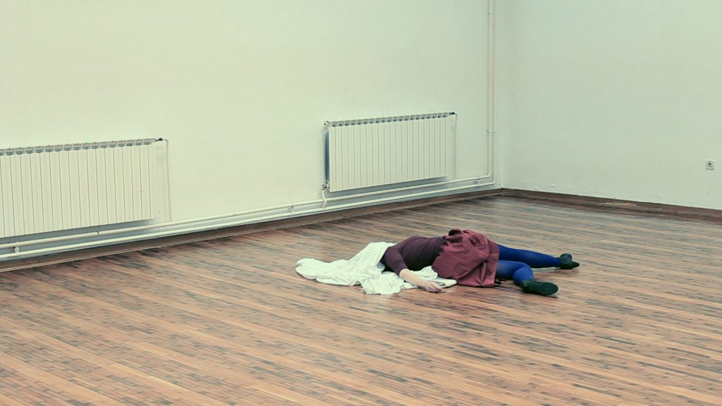 The video sequence is digitally cut up into a number of sections so that every new pose performed by the performer becomes a separate still image. Selected movement fragments are multiplied and repeated, and certain sections of the video in which the woman on the ground appears to be still, are replaced with the ‘frozen’ stills with extended duration. The accompanying sound comprises two alternating music phrases – using a digital sample of the harpsichord – which are played when the picture becomes frozen. In some sections of the work the music is sped up, and in others the two musical fragments are played in reverse. The sound of the harpsicord evokes the baroque suite and other forms of court music – albeit a decidedly low-fi version of it, which gives the scene an amateurish and unrehearsed feel.