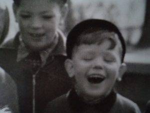 Although in the background of the photograph, outside the centre of the action, the boy’s face draws and fixes the gaze. He seems to be absent and lost in his inner world. His laughter (whether genuine or forced), disconnected from the scene he observes, appears to be an internal laughter, with its source somewhere else.