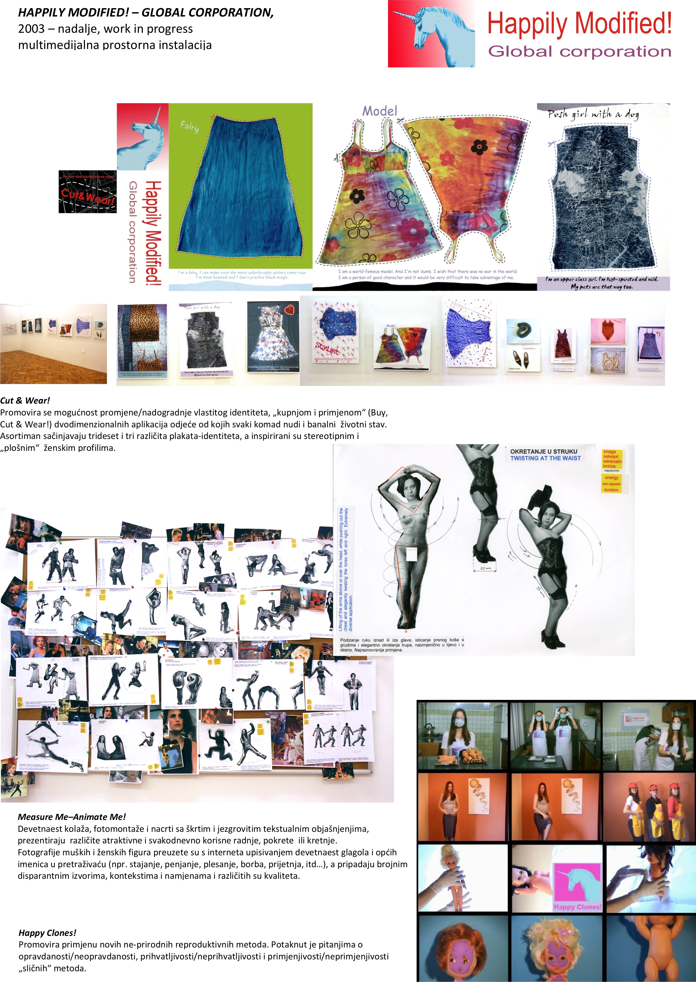 Happily Modified! or Thin Yellow Line, 2003–2004, is a multimedia spatial installation consisting of united projects: Happy Clones!, Cut&Wear!, Measure Me-Animate Me! The project was created as an advertising campaign for a fictitious corporation named Happily Modified. – Global Corporation, which aims to promote and sell new parallel, modified versions of oneself that are based on existing personality and identity features, enhanced with imaginary additional traits.